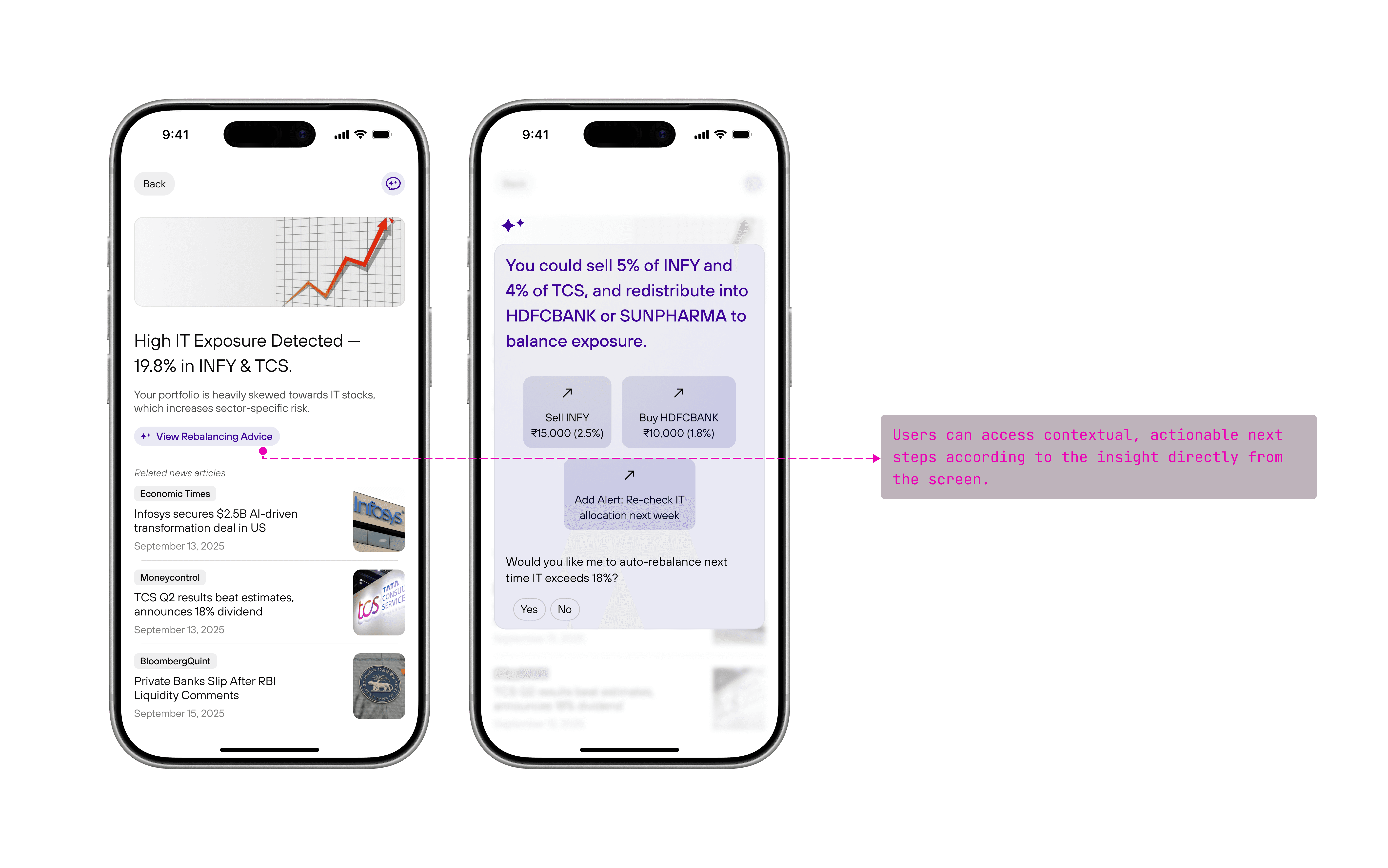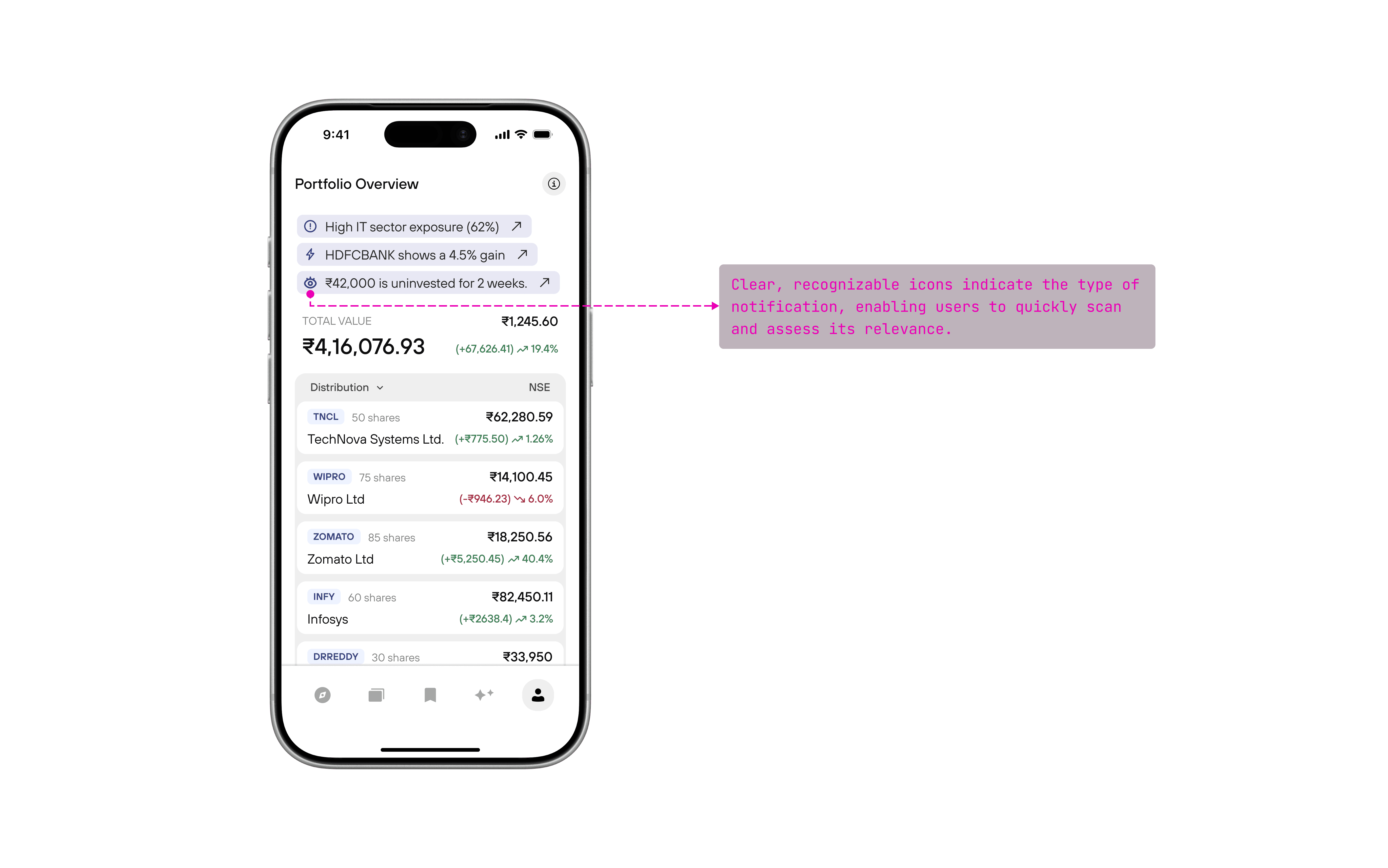 Instead of attaching insights to individual stocks, AI signals appeared in a top banner summarizing portfolio patterns (e.g., high sector exposure or recent negative news). Tapping revealed a brief explanation and the affected holdings.