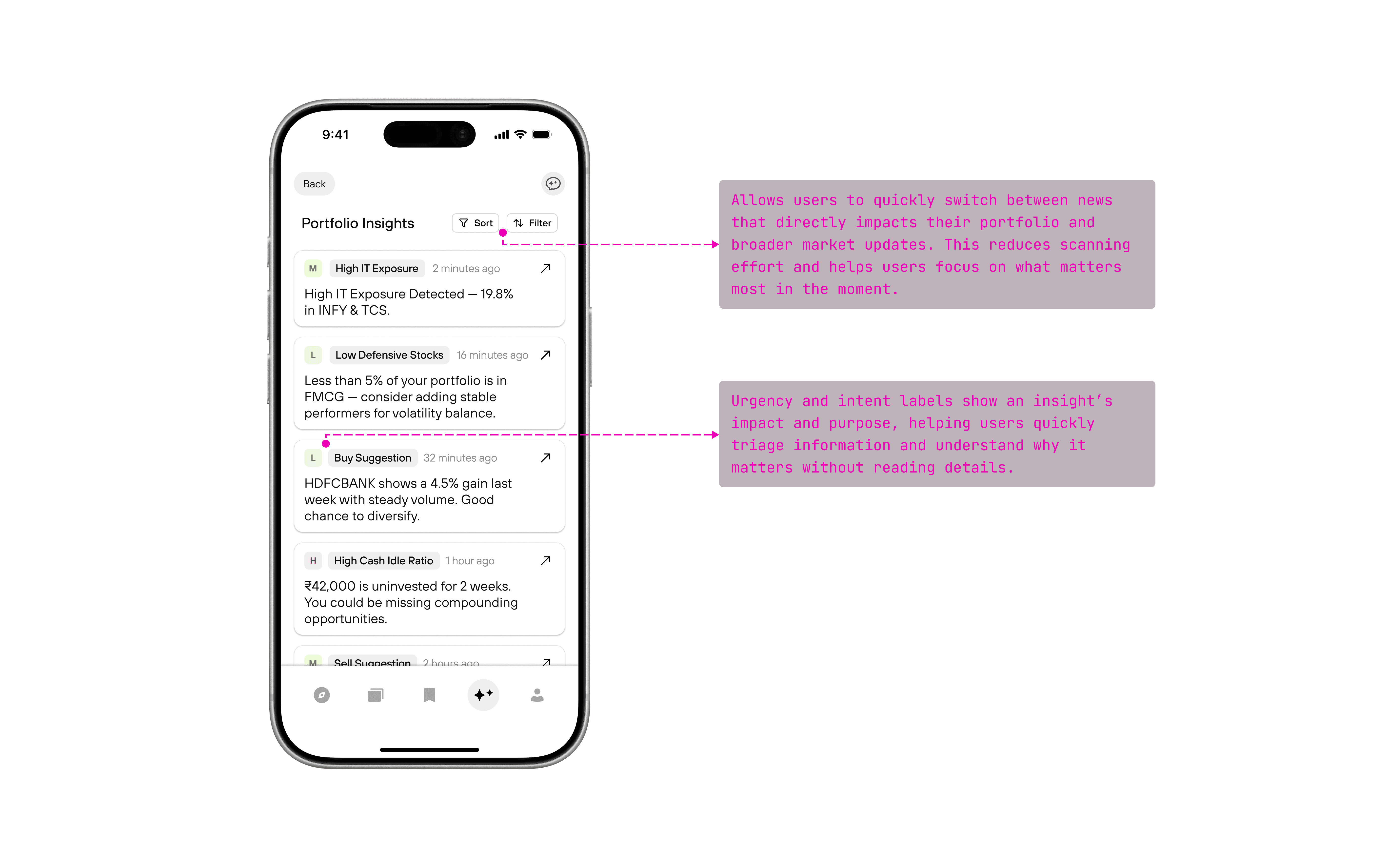 The AI Insights feature is implemented as a dedicated screen in the bottom navigation, separate from the portfolio and watchlist views. This screen aggregates AI-generated insights derived from market news, portfolio composition, and watched stocks, allowing users to explore insights intentionally rather than encountering them during quick portfolio check-ins.