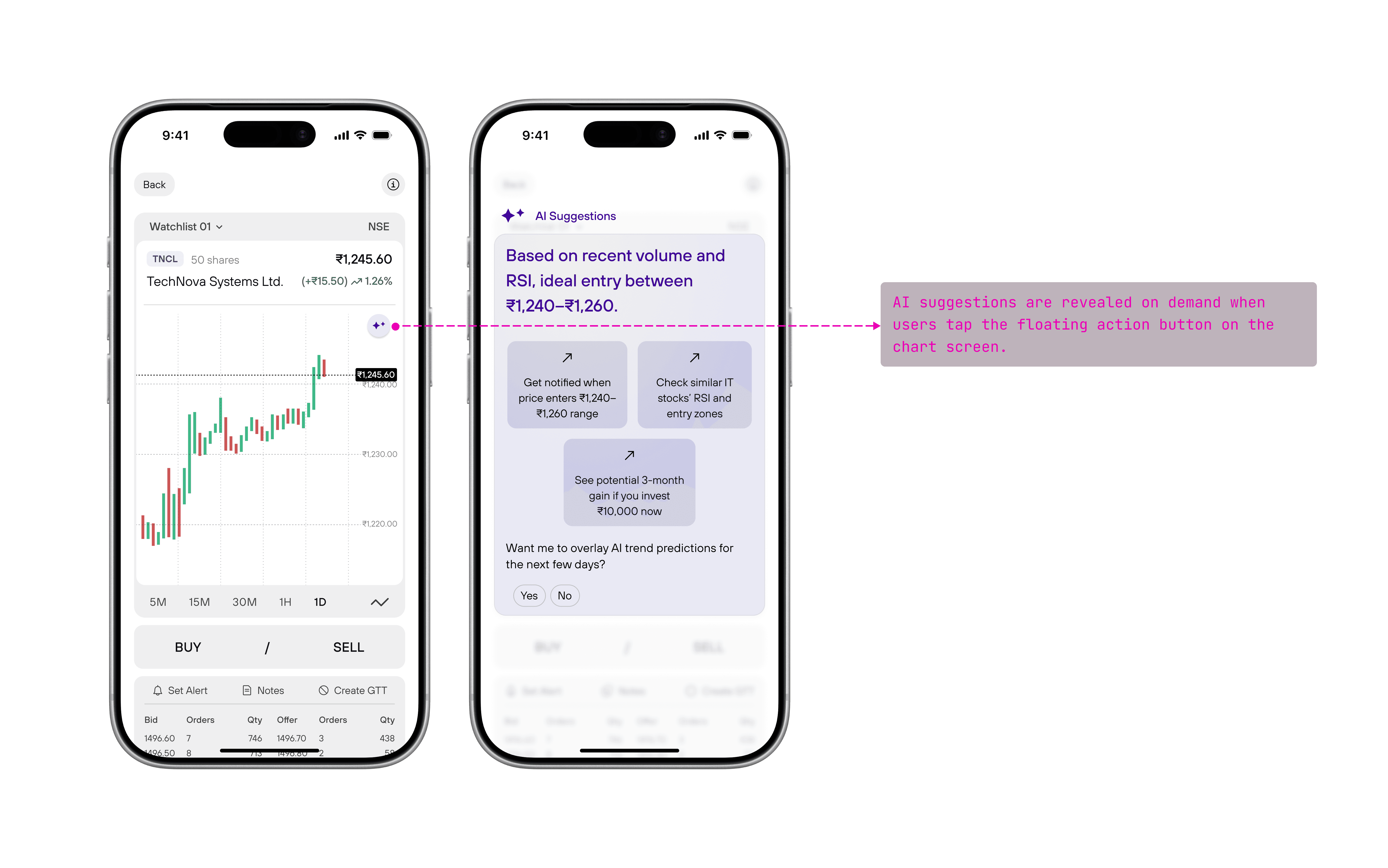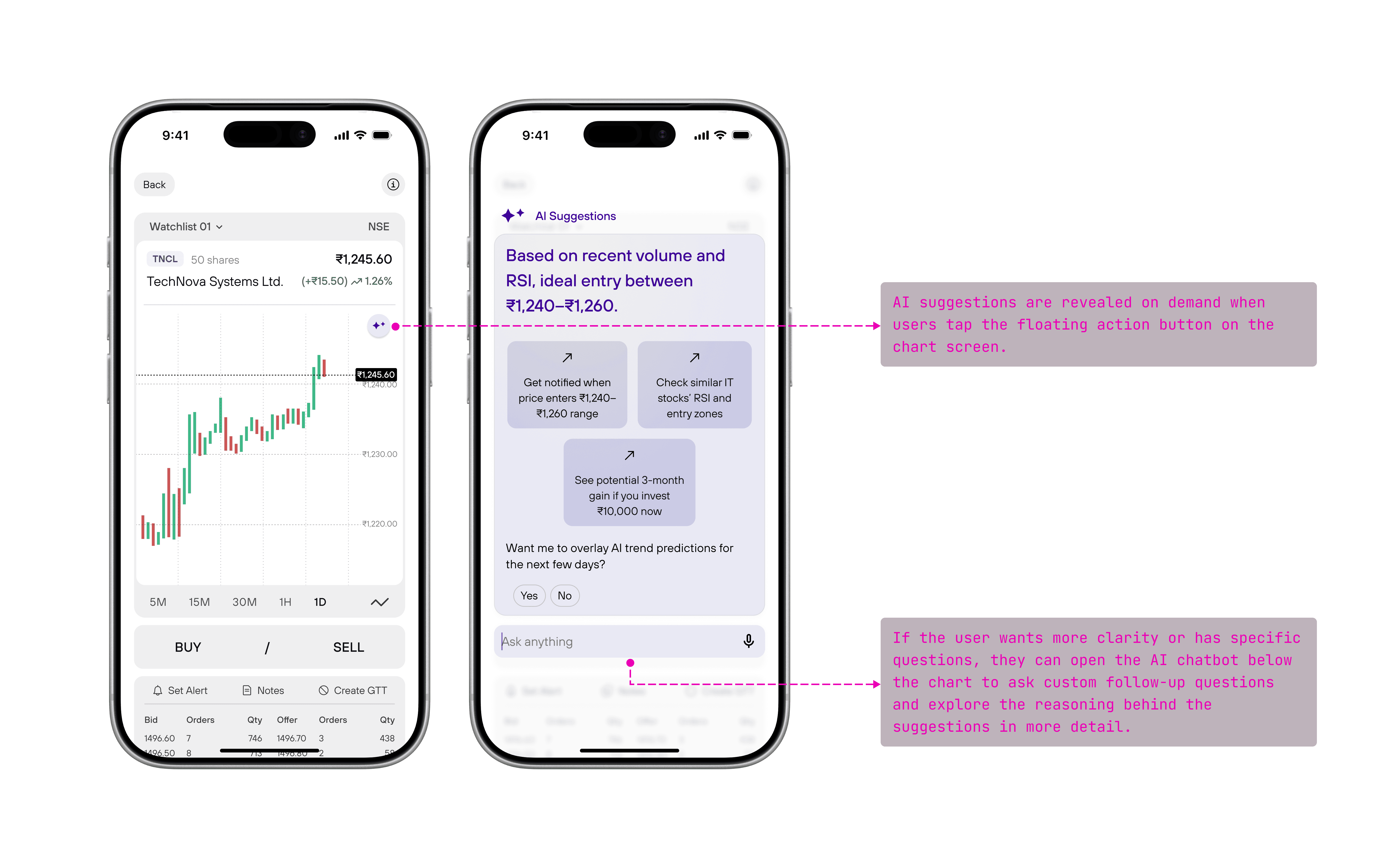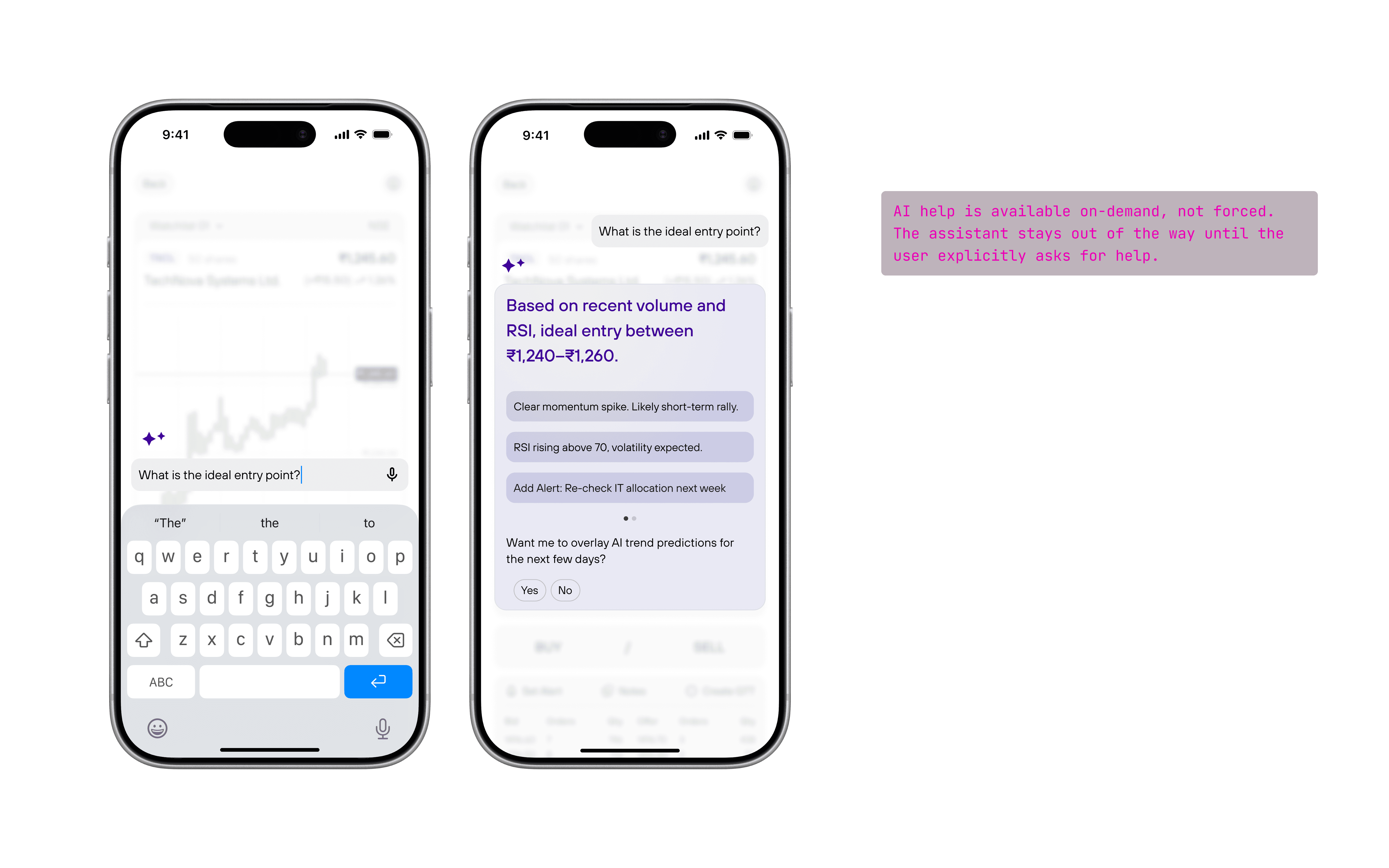 The chart stays clean while AI appears upon clicking the floating icon, where users can ask questions like “Is this a good price to buy?” or “Why did the stock drop here?” The AI responds in plain language, using the chart context to guide understanding.