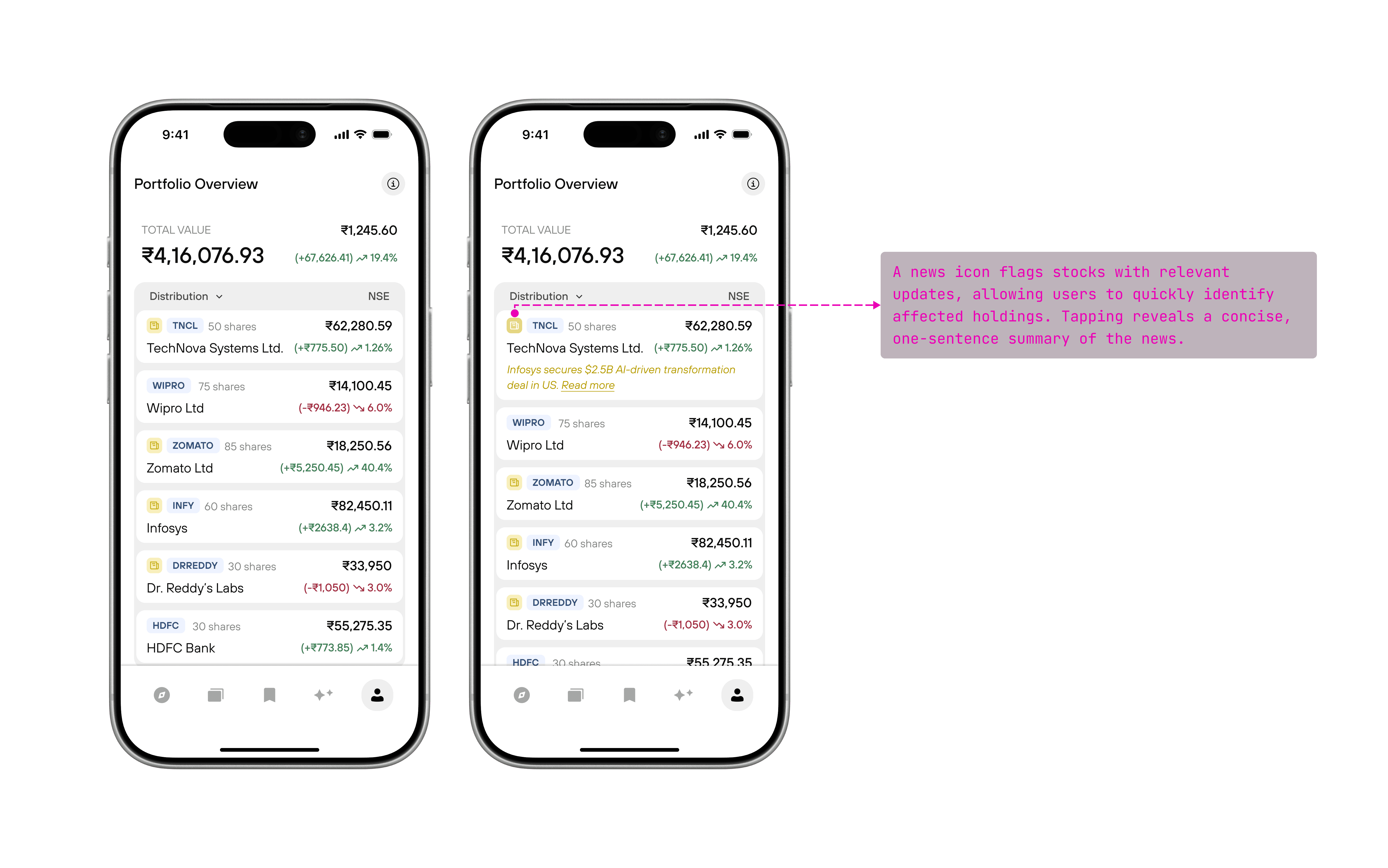 Inline news labels surface relevant market updates directly within the portfolio list, allowing users to identify affected stocks without leaving the primary view.